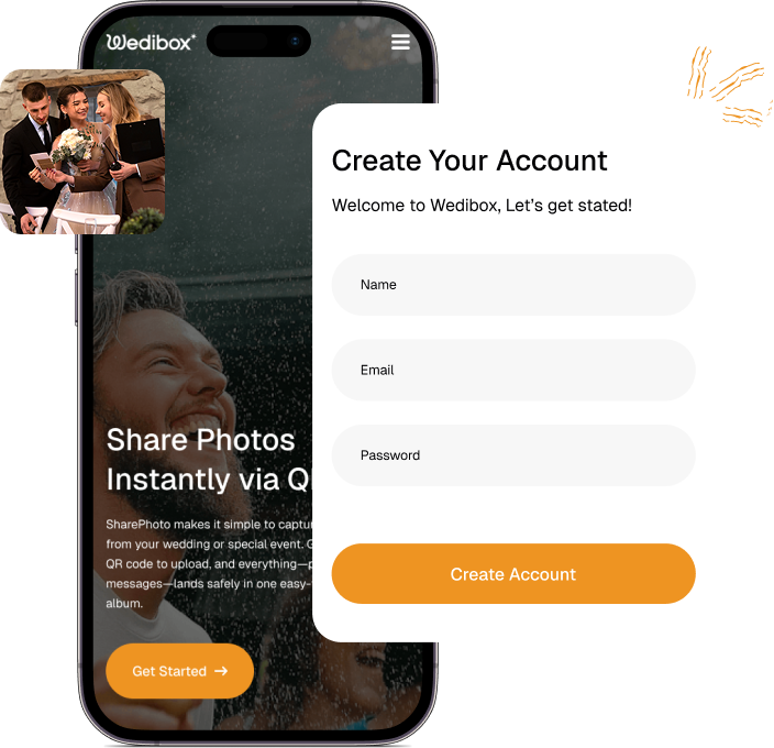 Create your free account in under 2 minutes and receive your custom photo sharing QR code instantly. No downloads or complex setup - just enter your name and event date to begin.